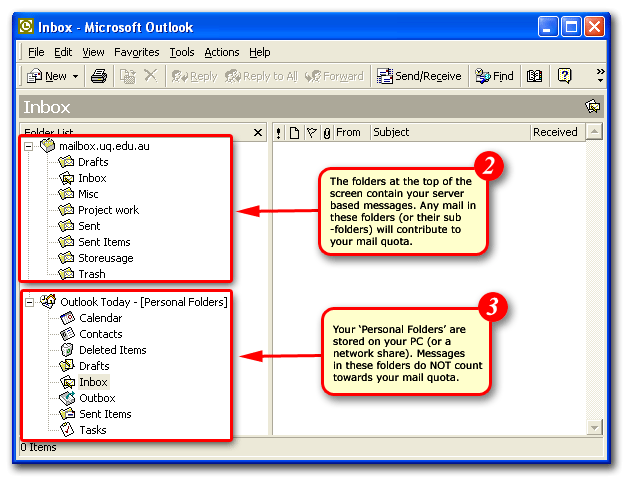 2)Examine the 'Folder List' on the left of the screen. The folders at the top of the page contain your server-based messages. Any messages in these directories will contribute to your mail quota. |