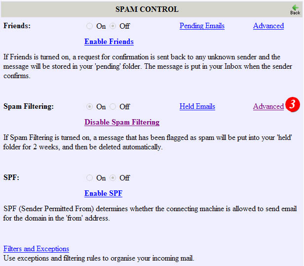 | 3)Select 'Advanced' to view, and edit your advanced Spam Filtering Settings. |